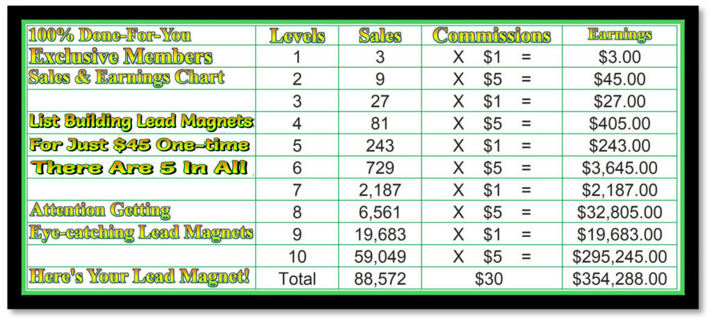 Well, you can get 5 of our professionally designed Lead Magnets that we use for just $45 One-time instead of $45 a month. Plus …you are also added to the 2nd 3×10 “Here’s Your Leads” List Building Global Team Matrix with an earnings potential of $354,288.00!