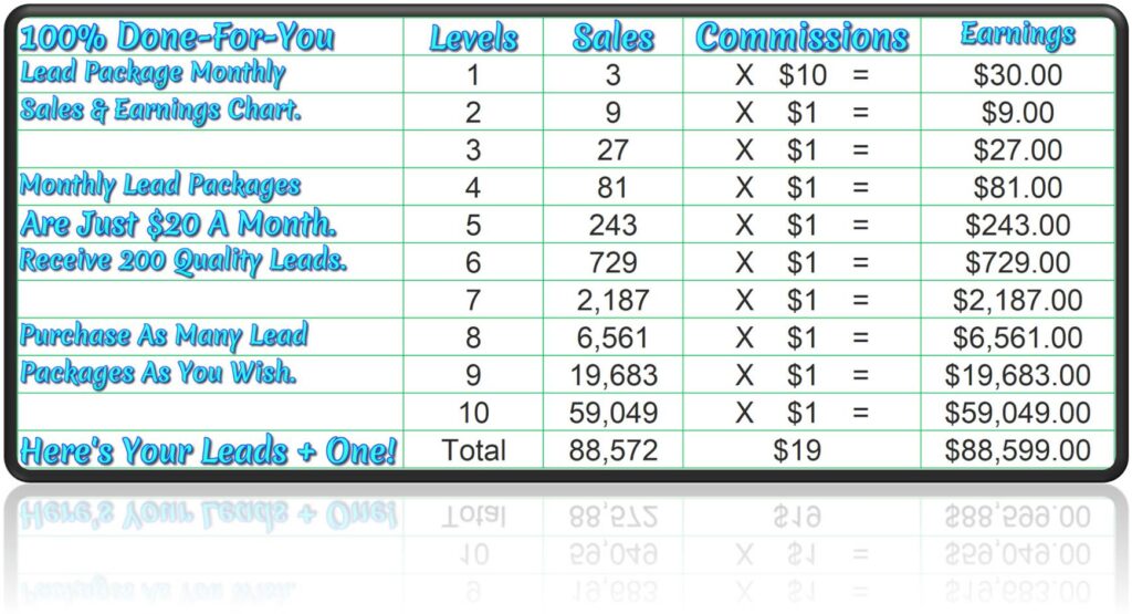 Purchasing this $20 a month lead package automatically adds you to the 3×10 “Here’s Your Leads” List Building Global Team Matrix. As an active affiliate, you are also eligible to receive all commissions as described and outlined in the affiliate 3×10 List Building Global Team Matrix Pay Plan on all of your referral’s Lead Package orders (no matter who referred them).
